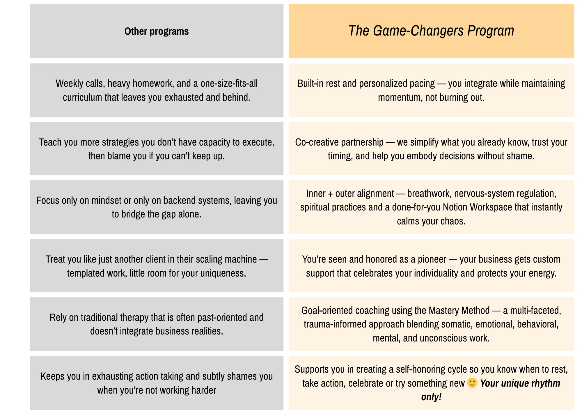 This multi-modality approach ensures you’re supported on every level—mental, emotional, somatic, spiritual, and strategic. It’s not a cookie-cutter program; it’s a holistic container designed to meet you where you are and help you scale sustainably.